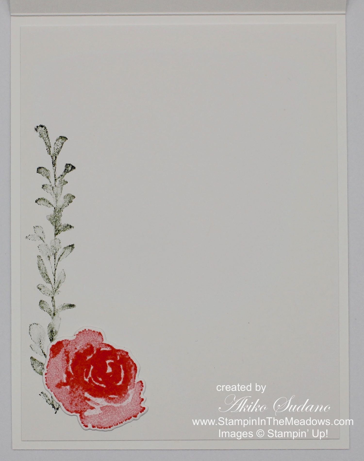 On the inside of the card, I took the leafy stem stamp and inked it in Mossy Meadow and after stamping off twice, I stamped it along the left side of the inside panel. I took another Flirty Flamingo rose and adhered it to the inside panel before adhering it to the inside of the card.