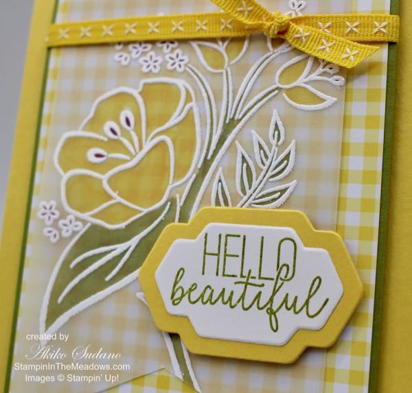 For the inside of the card, I embossed one of the single flowers from the Stampin’ Up! All That You Are stamp set in white on Daffodil Delight cardstock and two of the leaves in white on Old Olive cardstock. I fussy cut these with the paper snips. I adhered a strip of the Daffodil Delight gingham paper to the bottom of the inside Whisper White panel and matted it with Old Olive. I attached the flower and leaves using multipurpose liquid glue and adhered the panel to the inside of the card using snail.