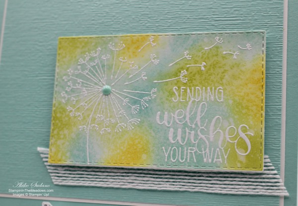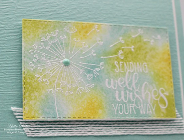 Then I made the art panel by running the embossing buddy over the sponged background and stamped the single dandelion and sentiment from the Stampin’ Up! Dandelion Wishes stamp set in Versamark Ink. I sprinkled it with white embossing powder and heat set. After it cooled I cut out it with the stitched rectangle die. I cut a piece of the Whisper White Flax ribbon and adhered it to the embossed panel with snail and adhered the art panel with dimensionals. I finished it off with an old Pool Party enamel dot from my stash.