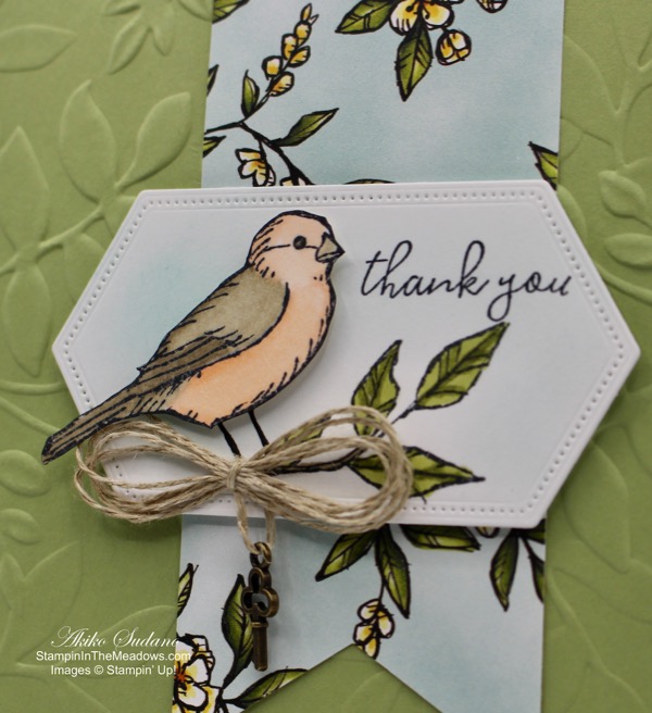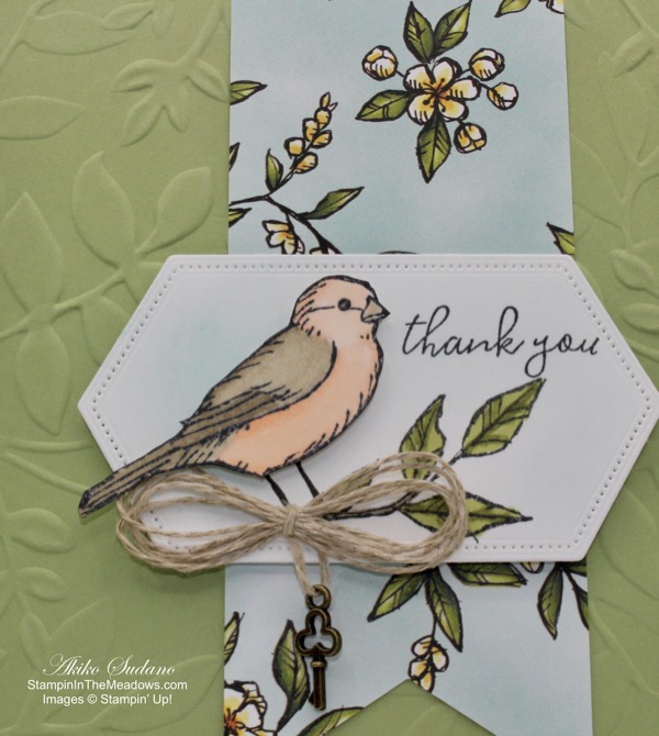 I then made a bow with the Linen Thread and attached a key from the Bird Ballad Trinkets to the bottom so that it dangles – such a fun touch for a card! Since I cut off the legs when I cut out the bird, I drew legs on the label using a black journaling pen. I then popped the bird on the label with dimensionals and glued the bow on with a glue dot. I used more dimensionals to attack the label to the banner.