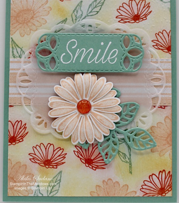 I cut an extended piece of the striped paper from the Magnolia Lane DSP using the 1″ Stitched Rectangle die. I die cut the large fancy Stitched Label die from vellum and heat embossed the Smile sentiment from the Stampin’ Up! Daisy Lane stamp set on Mink Macaron and die cut it using the smaller Stitched label Die.