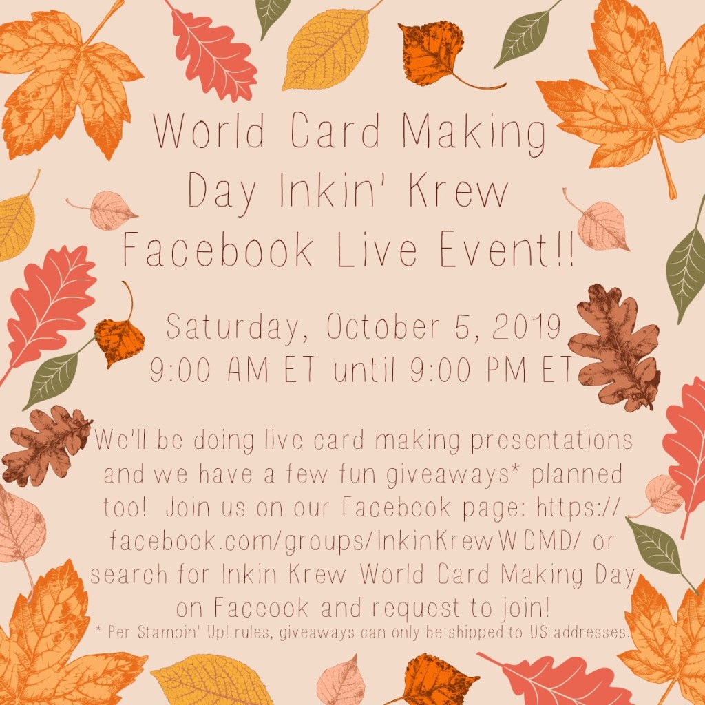 The Inkin’ Krew team is having a Facebook Live Event to celebrate World Card Making Day this Saturday, October 5. Amy Koenders has set up a Facebook Group where different team members will be doing live card making presentations throughout the day. Head to the Inkin Krew World Card Making Day Facebook page and join us! Oh, and there are some giveaways planned.