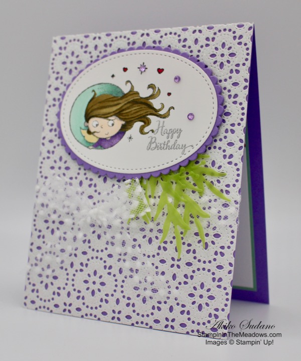 I started with a panel of Sparkle glimmer paper which I ran through the large Stitched lace die and adhered it to a Highland Heather card base. I stamped the little fairy with the the flowing hair from the Stampin’ Up! New Wonders stamp set in Memento Tuxedo Black ink on a panel of Whisper White. I then rubbed the lower left corner with the embossing buddy and stamped the Happy Birthday sentiment in VersaMark ink. I sprinkled it with silver embossing powder and heat set.