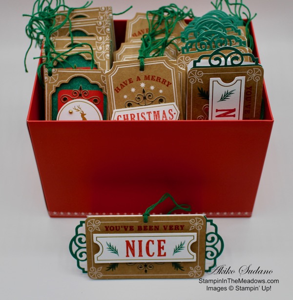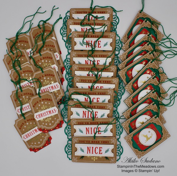 Good Morning! Today’s project is not a card, but a set of Christmas Tags made with the Stampin’ Up! Joy of Giving Tag Kit. This is an all inclusive kit that comes with a everything needed to make 30 Christmas tags. There are 3 designs and enough supplies to make 10 of each design.