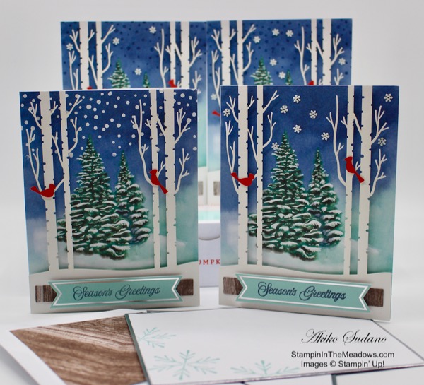 On the card on the left, I substituted VersaMark Ink and white embossing powder for the Night of Navy ink. In the card on the right, I didn’t stamp any falling snow and used the tiny snowflake sequins as falling snow. Which do you prefer? I like them both and can’t decide.