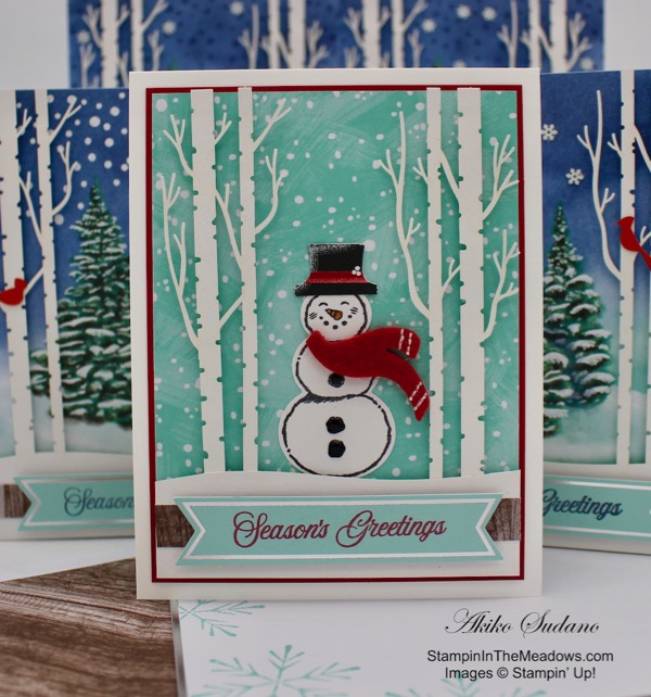 One thing that didn’t work out was using Delicata Silver ink for snow. So I had an extra set of beautiful birch trees that I had to put to use. So I stamped and punched a snowman and added some Let it Snow Specialty Designer Series paper and came up with this little cutie.