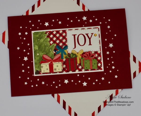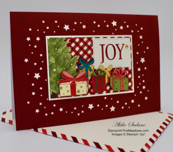 I fussy cut a tree from the tree paper in the Stampin’ Up! Night Before Christmas DSP and adhered it to a panel of the diagonal checked paper. I adhered the checked panel to a Very Vanilla mat. I stamped the Joy sentiment from the So Many Stars stamp set in Cherry Cobbler ink on Very Vanilla card stock and cut it out with one of the stitched rectangle dies before I adhered it to the checked paper.