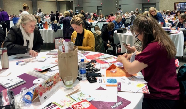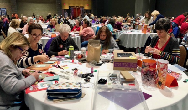 And Stampin’ Up! kept us busy all day with inspirational talks, stamping demonstrations of the new products and recognition of Demonstrators’s achievements. Here are a couple of pictures of my Inkin’ Krew Team Mates doing the Make and Takes – We got to make 4 cards using new stamp sets and other beautiful products from the upcoming catalog.