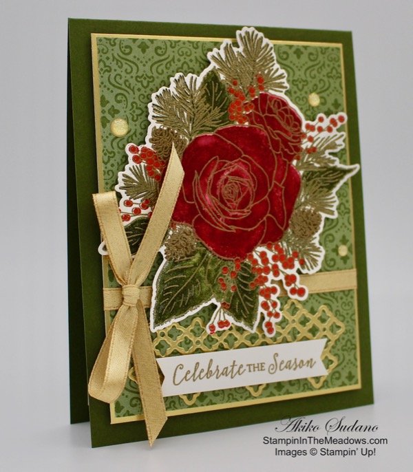 Next I cut a panel of the green paper from the Christmastime is Here specialty designer series paper and adhered it to a gold mat. I cut the lattice from gold foil with the large die and adhered it to the panel with liquid glue. I cut a strip of the shimmery gold ribbon and wrapped it around the panel, securing it in the back. I stamped the Celebrate the Season sentiment from the Itty Bitty Christmas stamp set in Versamark Ink on a strip of shimmery white card stock and sprinkled it with gold embossing powder and heat set. I then trimmed the ends and adhered it over the lattice with dimensionals. I adhered the floral bouquet on the panel with dimensionals and added a large bow made with the gold shimmer ribbon. I then popped the panel on a Mossy Meadow card base with dimensionals. I finished off the card front with three gold glitter enamel dots.
