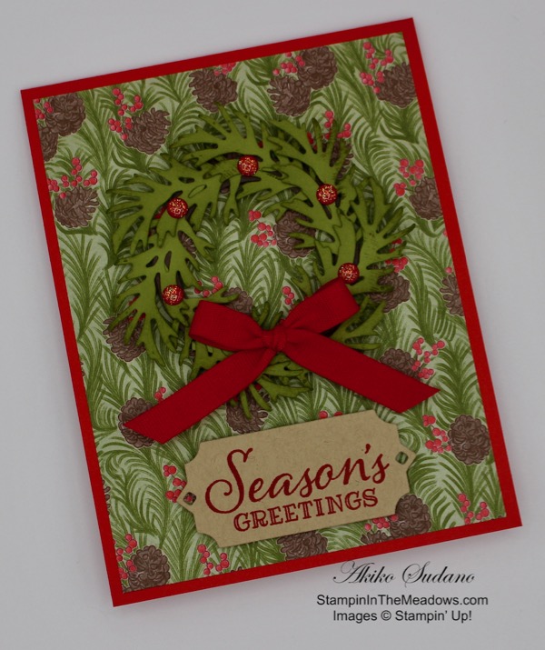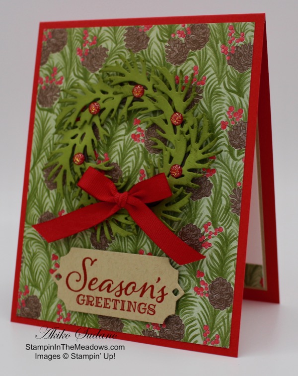 I thought the Christmastime Is Here pinecone paper would coordinate nicely with the Stampin’ Up! Peaceful Boughs bundle. What do you think?