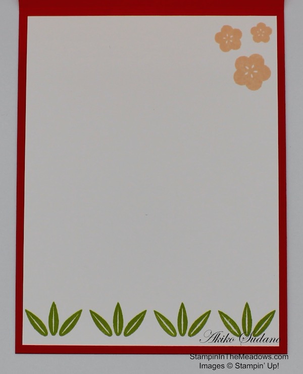 I stamped another row of leaf clusters using Granny Apple Green ink on a Whisper White panel for the inside of the card. I added a cluster of plum flowers in Petal Pink in the upper corner and then adhered it to the inside of the card with snail.