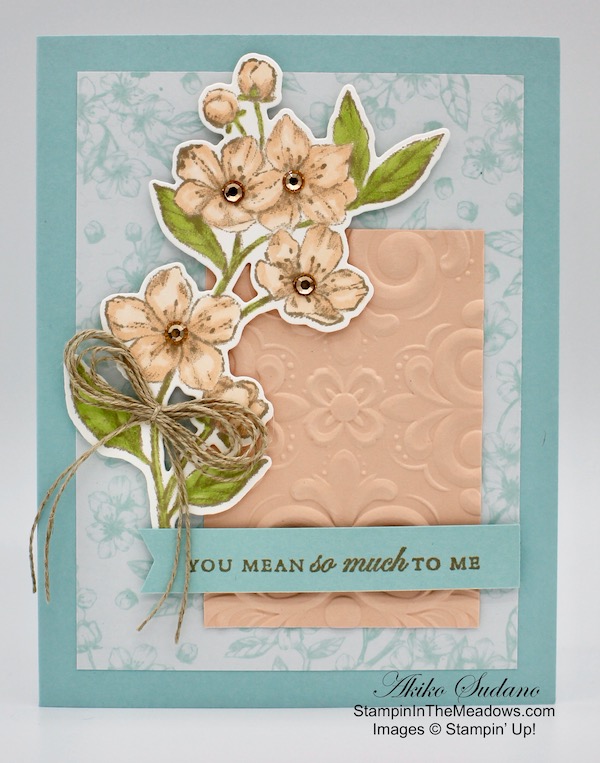 I made a bow with Linen Thread and attached it to the cherry blossoms with a glue dot. I stamped the sentiment from the Stampin’ Up! Forever Blossoms stamp set in Sahara Sand ink on a strip of Pool Party card stock. I trimmed the end and adhered it to the card front with dimensionals.