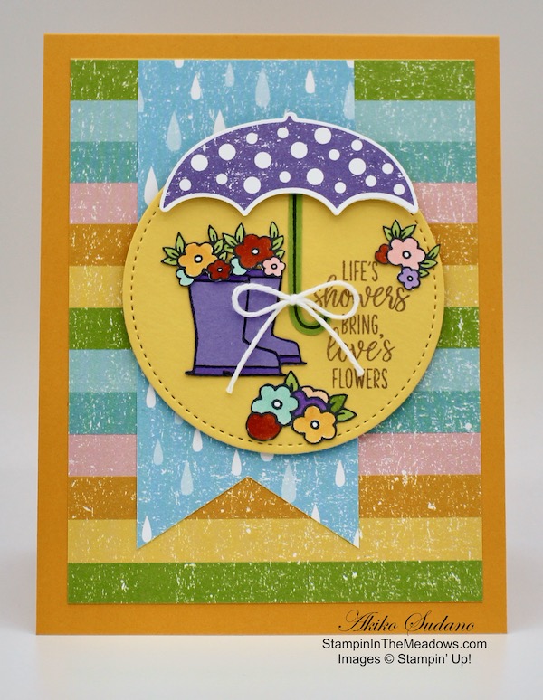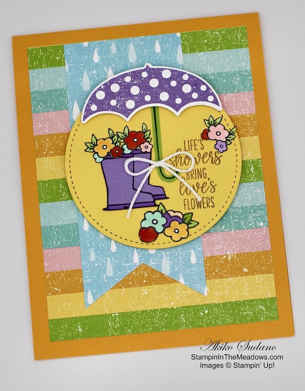 I cut a stitched circle with the Stitched Shapes dies from Daffodil Delight card stock and stamped the sentiment from the Stampin’ Up! Under My Umbrella stamp set in Highland Heather ink. I stamped the boots in Memento Tuxedo Black ink on Highland Heather card stock and fussy cut it out. I stamped several flower clusters in Memento Tuxedo Black ink on Whisper White. I colored them with Light Granny Apple Green, Dark Calypso Coral, Dark Pool Party, Dark Mango Melody, Light Flirty Flamingo and Light Highland Heather Stampin’ Blends and fussy cut them. I adhered the boots, flowers and umbrella handle to the stitched circle with multipurpose liquid glue and the umbrella with dimensionals. I finished off the circle with a Whisper White Baker’s Twine bow.