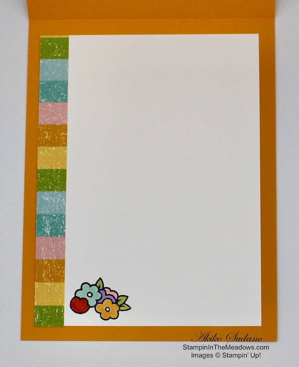 I added a strip of the striped Pleased as Punch paper to the side of a Whisper White panel and stamped a flower cluster next to it. I colored the flowers with Stampin’ Dimensionals to match the flowers on the front. I adhered the panel to the inside of the card with snail.