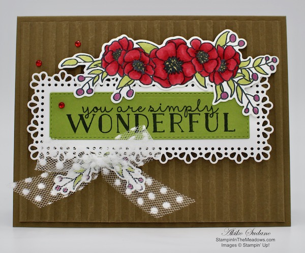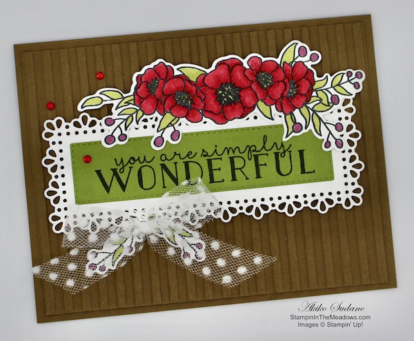 Oh – this is wonderful, Akiko! Love that corrugated background – it’s rustic and super cool with the more frilly accents of your floral sentiment. PERFECT!!