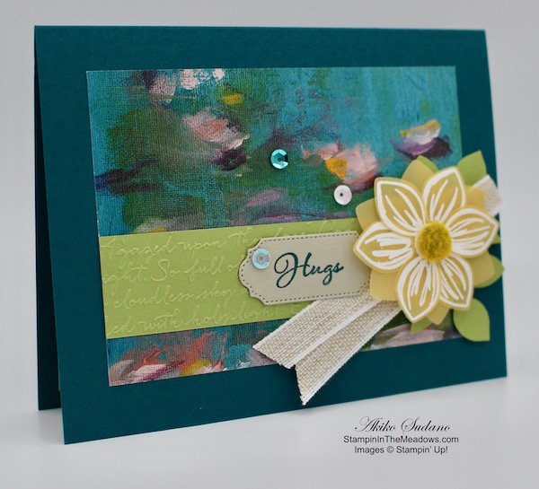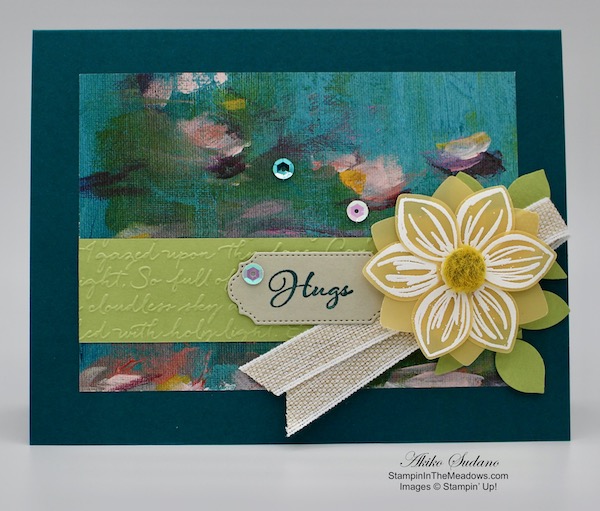 Adhere the flower to the card with dimensionals. Stamp the Hugs sentiment from the Stampin’ Up! Positive Thoughts stamp set in Pretty Peacock ink on a strip of Sahara Sand card stock. Cut it out with the die from the Ornate Frames dies. Adhere the label to the card with glue dots. Finish with three Woven Threads Sequins.