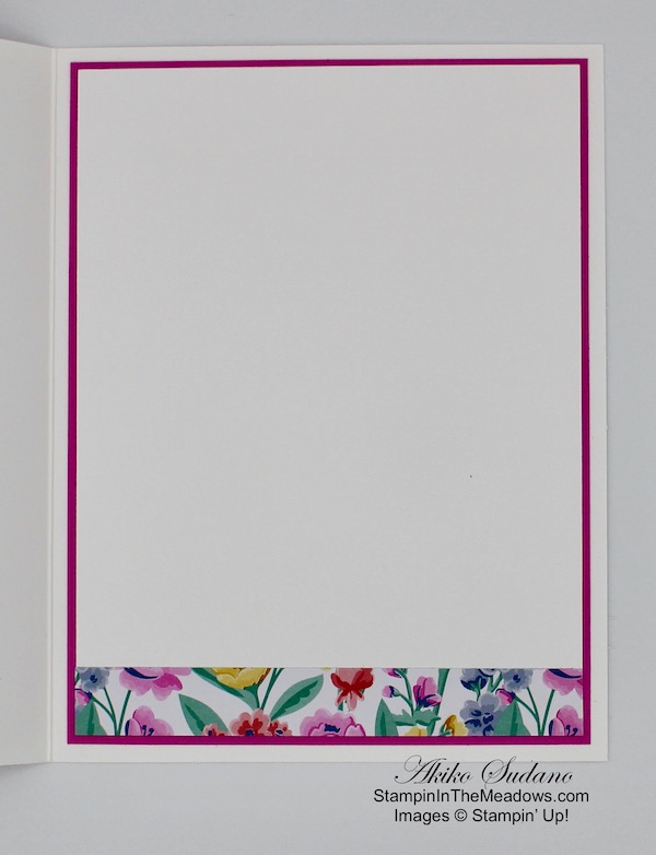 I decorated the inside by adhering a strip of the Flowers for Every Season DSP to the bottom of a Whisper White panel. I adhered the panel to a Magenta Madness mat and then to the inside of the card.