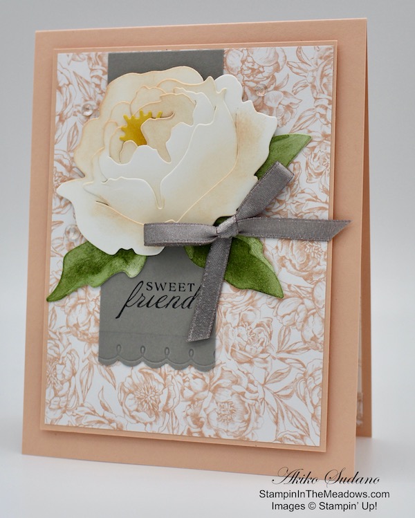 Good Morning! Today I’m sharing a friendship card made with the Stampin’ Up! Prized Peony bundle that I made during my Facebook Live video tutorial yesterday afternoon. The Stampin’ Up! Prized Peony bundle is one of the new sets in the 2020-2021 Annual Catalog. I’ve grown peonies in my garden for several years now and they’re one of my favorite flowers. Last week, they started to bloom, but we had some severe storms over the last few days, so they aren’t so pretty anymore ☹️. So I’ll wait for them to bloom next year to get some pictures. You can find the supplies used to create this card at the bottom of my post along with the sizes of cardstock used.