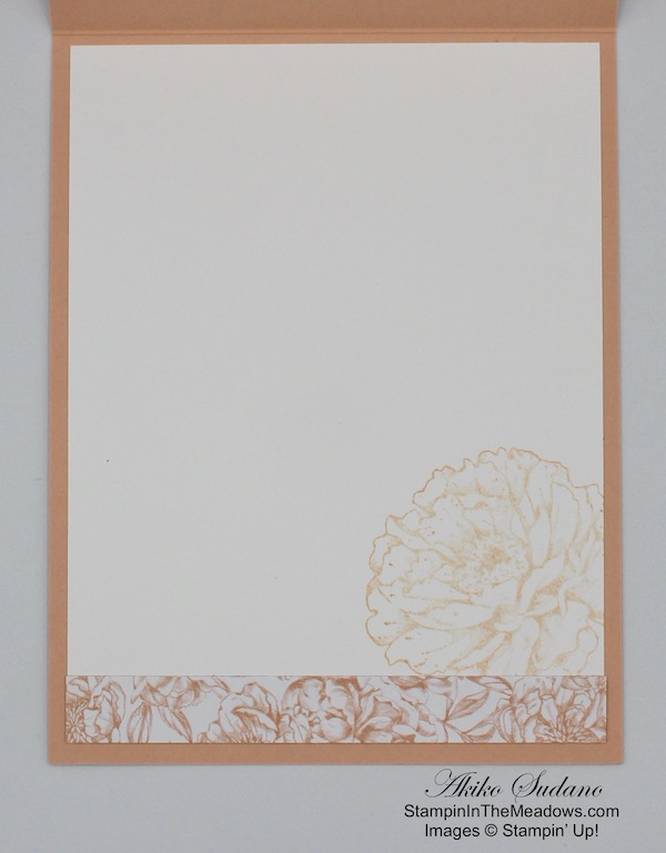 I stamped the medium peony from the Stampin’ Up! Prized Peony to the bottom of a Whisper White panel after stamping off and adhered a strip of the Peony Garden designer series paper to the bottom. I adhered the panel to the inside of the card with multipurpose liquid glue.