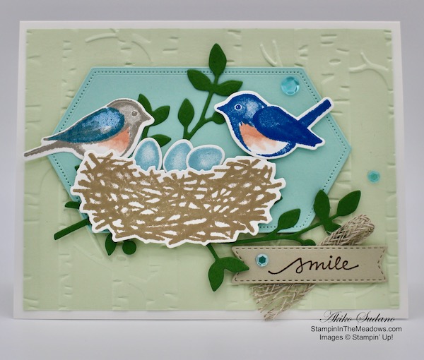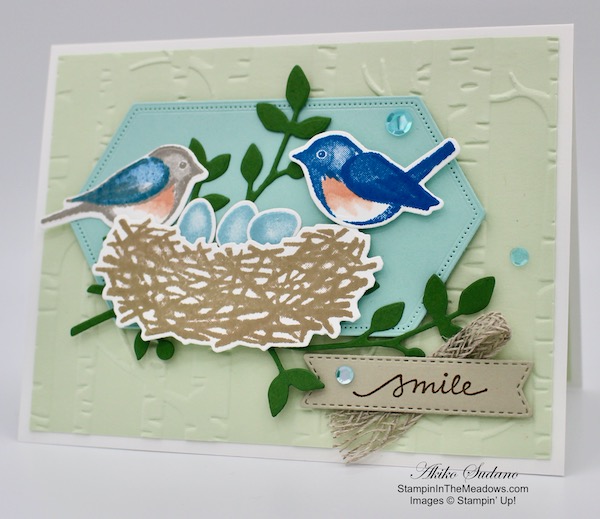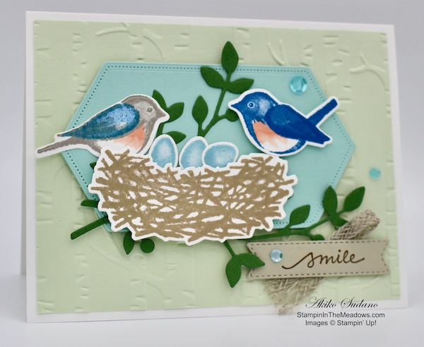 Good Morning! Today I’m sharing a Smile card made with the Stampin’ Up! Birds and Branches bundle that I made during my Facebook Live video tutorial Saturday afternoon. I used the sweet stamped birds with the nest and the smile sentiment from the Lovely You stamp set. You can find the supplies used to create this card at the bottom of my post along with the sizes of cardstock used.