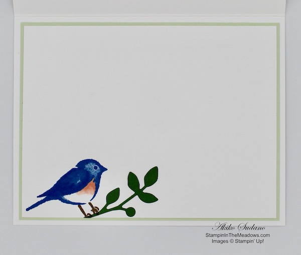 I stamped a male blue bird on a Whisper White panel using the Stampin’ Up! Birds and Branches stamp set and added another Garden Green die cut branch. I gave him some legs and adhered the panel to a Soft Sea Foam mat and then to the inside of the card.