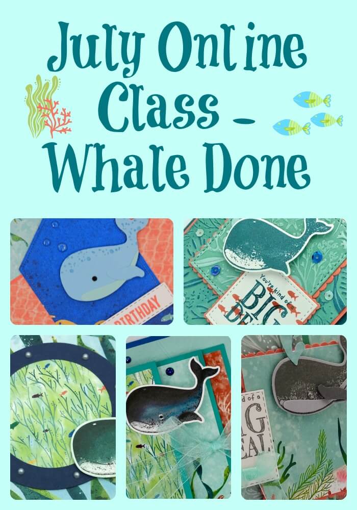 Did you know that when you place your $50 or more Stampin’ Up! order with me as your demonstrator, I will send you thank you gifts? First, you get to choose an item from the new catalog valued up to $10. Second, I will send you a link to download my Online Class Tutorial. This tutorial is a PDF file containing detailed instructions to create 4-5 projects centered around a current bundle. And the bundle changes every month!! This month, I am featuring the cute Whale Done bundle. Here’s a sneak peek at the projects: