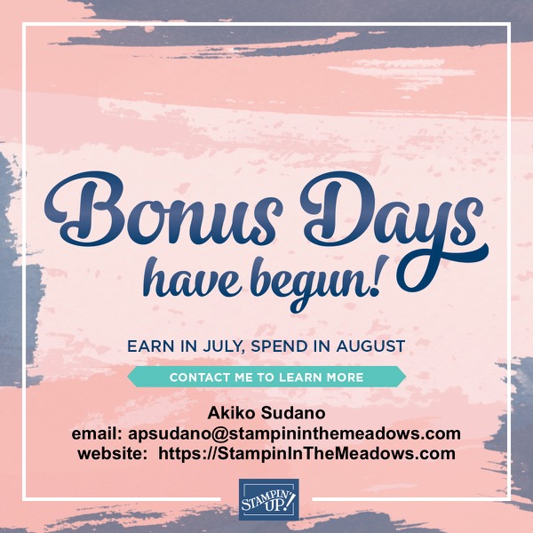 Click here to head over to my Online Store to start earning those Bonus Days Coupons now. If you have questions, click on the image below for answers to some common questions or drop me an email me at apsudano@stampininthemeadows.com