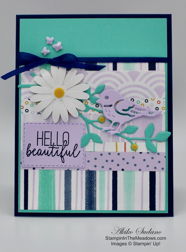 Beautiful Akiko 🙂 Love the strips of different DSP’s for the background and your little bird is a perfect touch