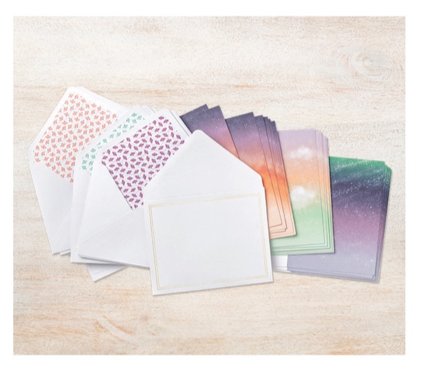 And here is the Add on Kit (item 154973 – $10) that you can purchase here. It consists of 24 beautiful card bases and coordinating envelopes. The card bases are different images than the postcards in the kit, but with the same beautiful colors and watercolor look. The envelopes are so cute with the gold foil and colorful firefly linings.