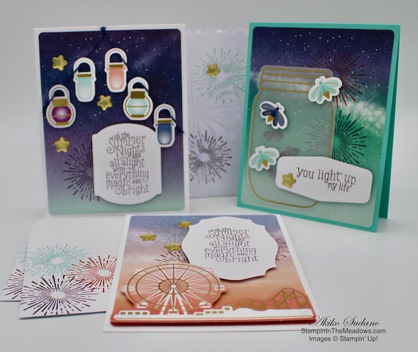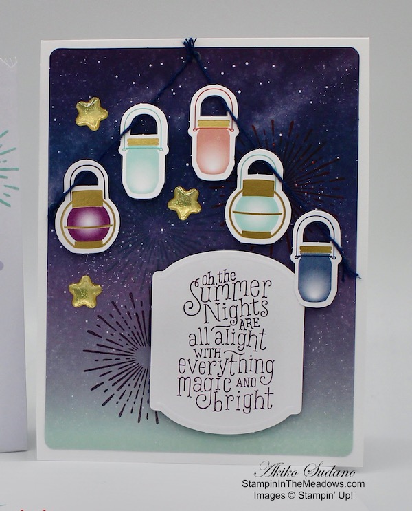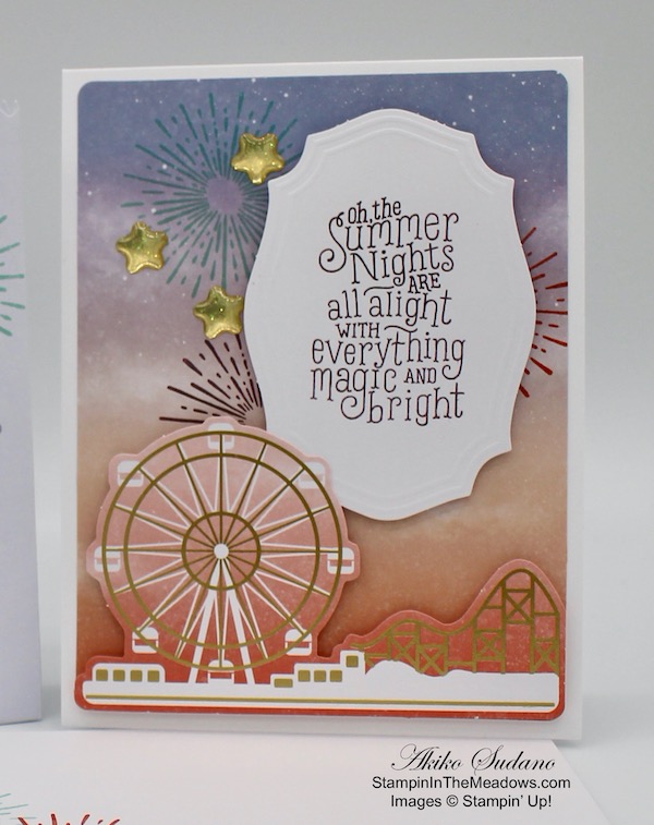 Hello! Last week I received my July Paper Pumpkin kit and I put together some of the projects but instead of making postcards, I turned them into cards. And it was so easy because the postcards fit perfectly on a 4-1/4″ x 5-1/2″ standard card base. The backgrounds are so pretty with the colors of sunset and the look of watercolor. And the projects really capture the magic and innocence of Summer Nights.