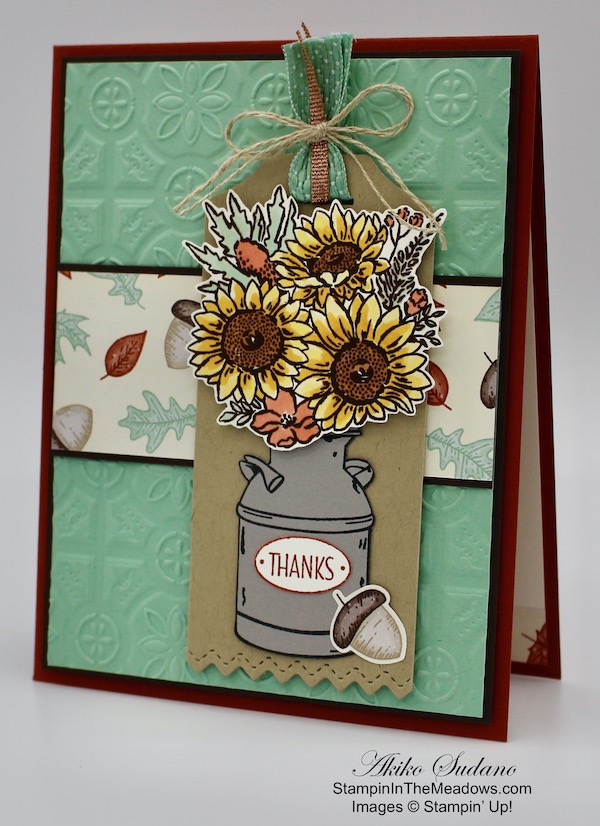 I stamped the label and Thanks sentiment from the Country Home stamp set in Cajun Craze ink on a small panel of Very Vanilla. I fussy cut it out and adhered it to the milk can with liquid glue. I punched out an acorn from the Gilded Autumn designer series paper with the acorn punch from the Autumn Punch Pack and adhered it to the bottom of the tag. I adhered the decorated tag to the embossed panel with dimensionals and popped the panel on the front of a Cajun Craze card base.