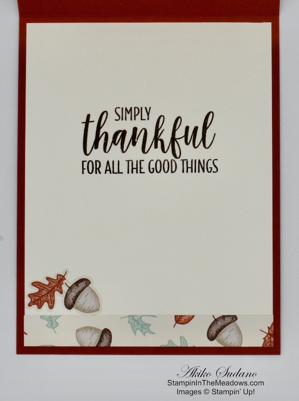 I stamped the sentiment from the Country Home stamp set in Early Espresso ink on a Very Vanilla panel. I trimmed the bottom with a strip of Gilded Autumn DSP and added a punched oak leaf and acorn to finish the inside panel.