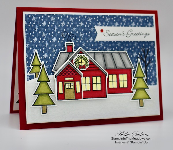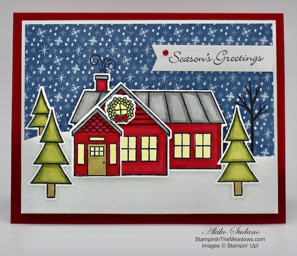 I adhered the two smaller houses together with liquid glue and popped them on the larger house with dimensionals. I added the wreath with dimensionals and the two large pine trees with dimensionals and liquid glue. I stamped the sentiment from the Itty Bitty Christmas stamp set in Tuxedo Black in on a strip of Whisper White. I trimmed the end with the new Banners Pick a Punch and adhered it to the front with liquid glue. I finished the label with a red rhinestone. I popped the little scene onto the front of a Real Red card base with dimensionals.