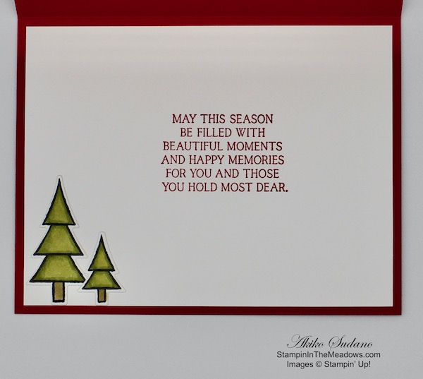 I stamped the sentiment from the Toile Christmas stamp set in real red ink and adhered the last two trees to the bottom of a Whisper White panel. I adhered the panel to the inside of the card.