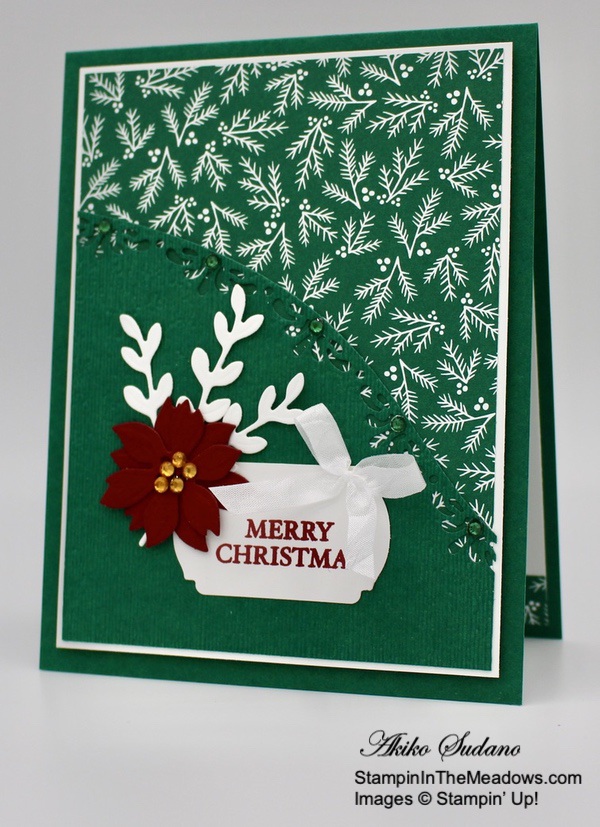 Cut a Whisper White label with the Timeless Label Punch and stamp the Merry Christmas sentiment from the Stampin’ Up! Curvy Christmas photopolymer stamp set (available November 3) in the lower corner in Cherry Cobbler ink. Adhere the label to the card front. Cut out two Cherry Cobbler flowers from the Wreath Builder Dies and adhere them together. Cut out three sprigs from the Curvy Dies (available November 3) from Whisper White card stock and adhere them to the back of the flower. Adhere the flower to the card front.