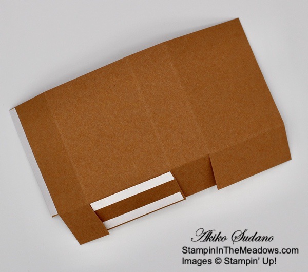 Cut a panel of Bumblebee card stock to 2″ x 6-3/4″. Score the long side at 1/4″, 1-1/4″, 3-1/2″ and 4-1/2″. Score the short side at 1″. Fold on the score lines and trim the little flap off. Cut the bottom lines and adhere Tear & Tape as shown on the picture below. Adhere the side first and then fold the bottom short flaps up before adhering the bottom.