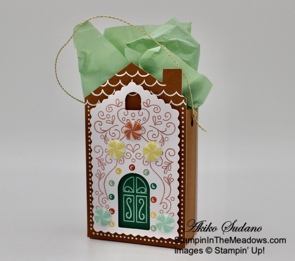 Adhere the gingerbread houses to the side and punch holes in the side and tie a handle with one of the pretty gold trims. I used the Paper Pumpkin Mint Macaron tissue to line the box and now it’s ready to hang on my Christmas Tree! And now that Thanksgiving is over, it’s time to get going with the Christmas decorating!!