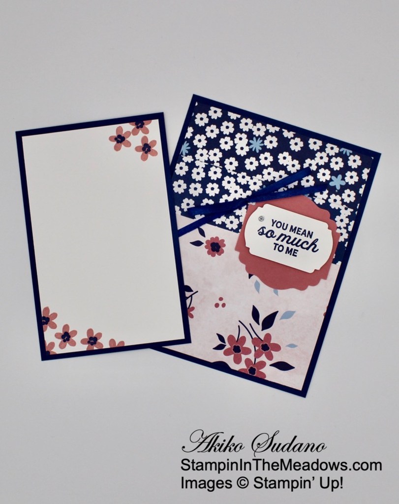 I stamped the little flower from the Stampin’ Up! In Bloom stamp set in Rococo Rose at the top and bottom of a Basic White panel. I stamped the flower centers in Night of Navy ink and adhered the panel to a Night of Navy mat. This leaves plenty of room to write a message and the card easily slides in and out of the pocket.