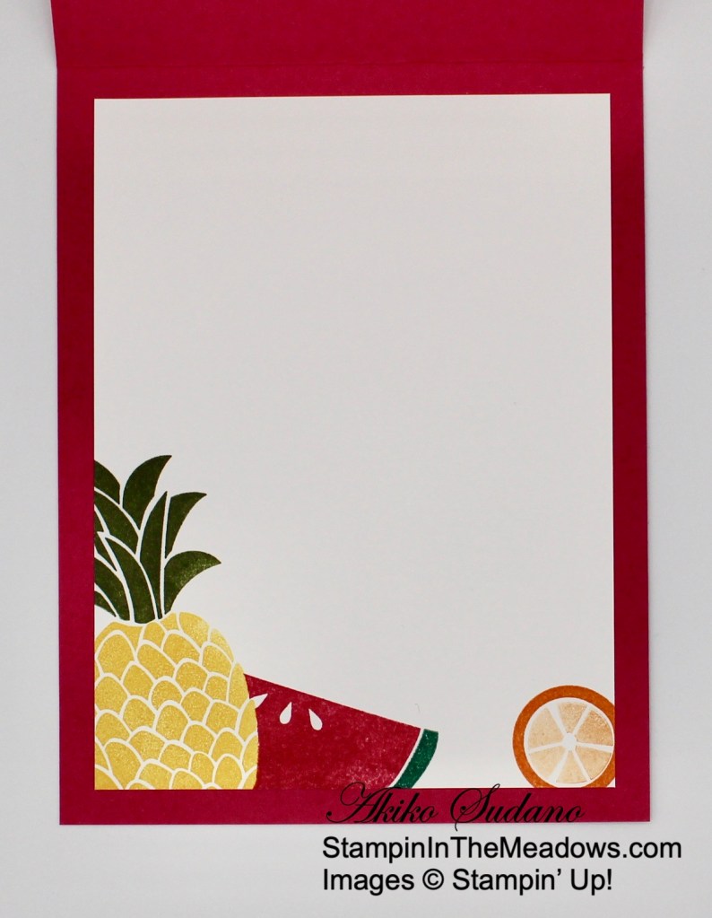 For the inside of the card, I stamped the pineapple in Mossy Meadow and Bumblebee like the front in the corner of a Basic White panel. I covered it with the post-it note mask and stamped the watermelon next to it in Melon Mambo and Shaded Spruce. In the opposite corner, I stamped the orange in Pumpkin Pie and then adhered the panel to the inside of the card.