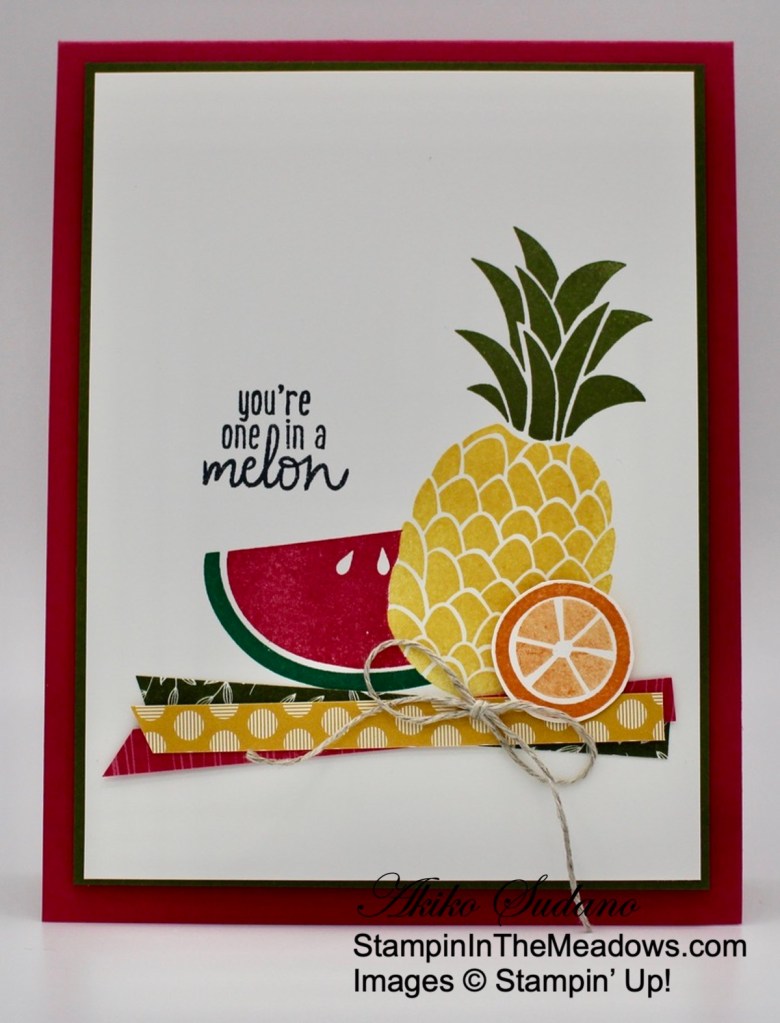 I adhered the post-it note mask to cover the pineapple and stamped the watermelon center from the Stampin’ Up! Cute Fruit stamp set in Melon Mambo ink next to the pineapple, overlapping the masked pineapple. Doesn’t it make the watermelon look like it’s behind the pineapple? I stamped the watermelon rind in Shaded Spruce next to the watermelon, aligning the tops. On a separate Basic White panel, I stamped the orange center in Pumpkin Pie after stamping off and then the orange peel in Pumpkin Pie, aligning the centers. I fussy cut the orange. I stamped the sentiment in Memento Tuxedo Black ink and adhered the panel to a Mossy Meadow mat.