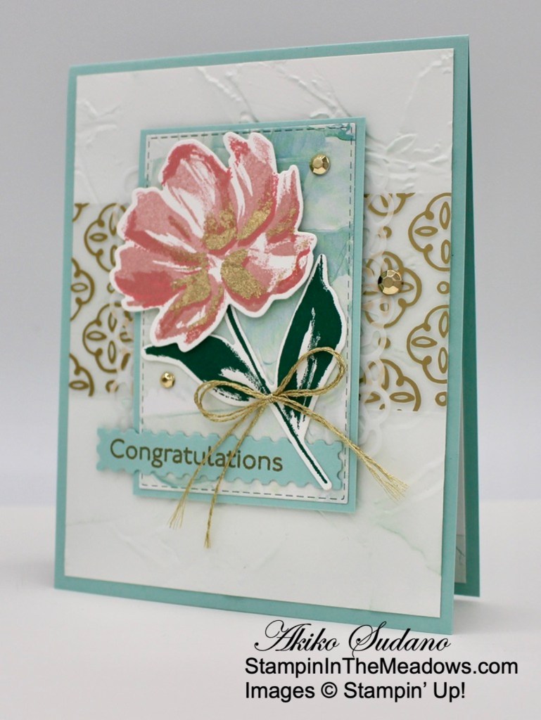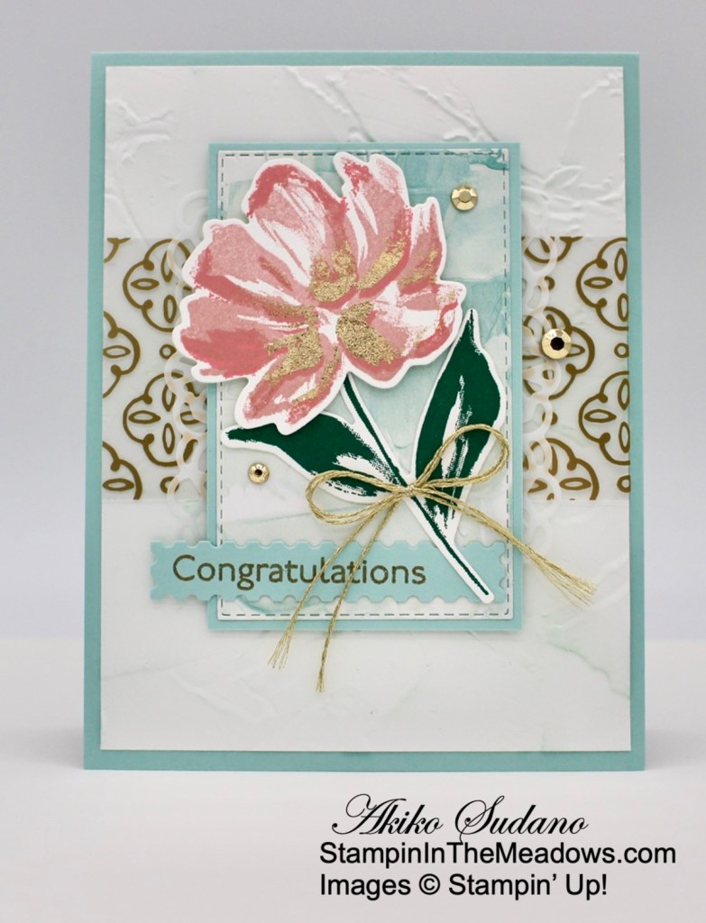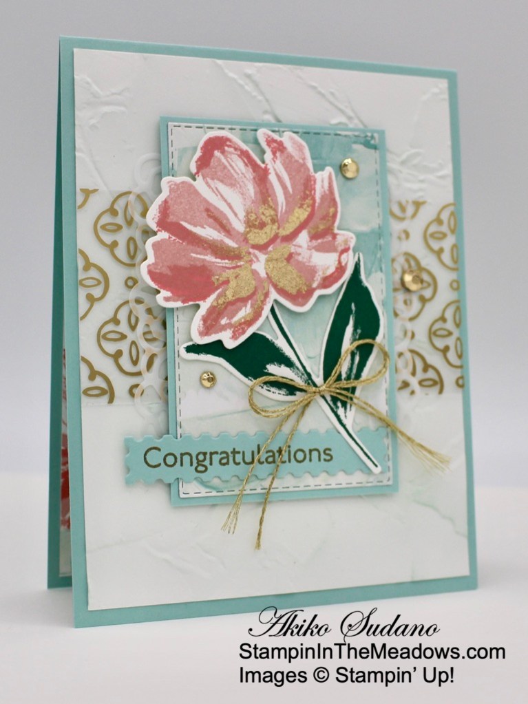 Happy Friday! I pulled out the beautiful Stampin’ Up! Art Gallery bundle for a soft, feminine congratulations card to share today. I also added some touches of gold, including the Golden Garden acetate for some fun bling! You can find the supplies used to create this card at the bottom of this post along with the sizes of card stock used.