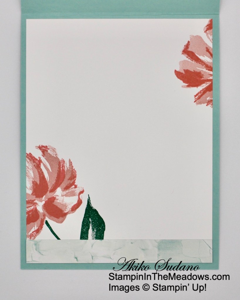 For the inside of the card, I the stamped the large flower and stem from the Stampin’ Up! Art Gallery stamp set in Blushing Bride, Flirty Flamingo and Shaded Spruce in the corners of a Basic White panel. I adhered a strip of Fine Art Floral DSP to the bottom of the panel and adhered it to the inside of the card.