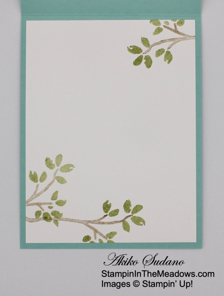 For the inside of the card, I stamped the branches from the Stampin’ Up! Birds & Branches stamp set in stamped off Soft Suede ink on a Basic White panel. I stamped the leaves in stamped off Old Olive and adhered the panel to the inside of the card.