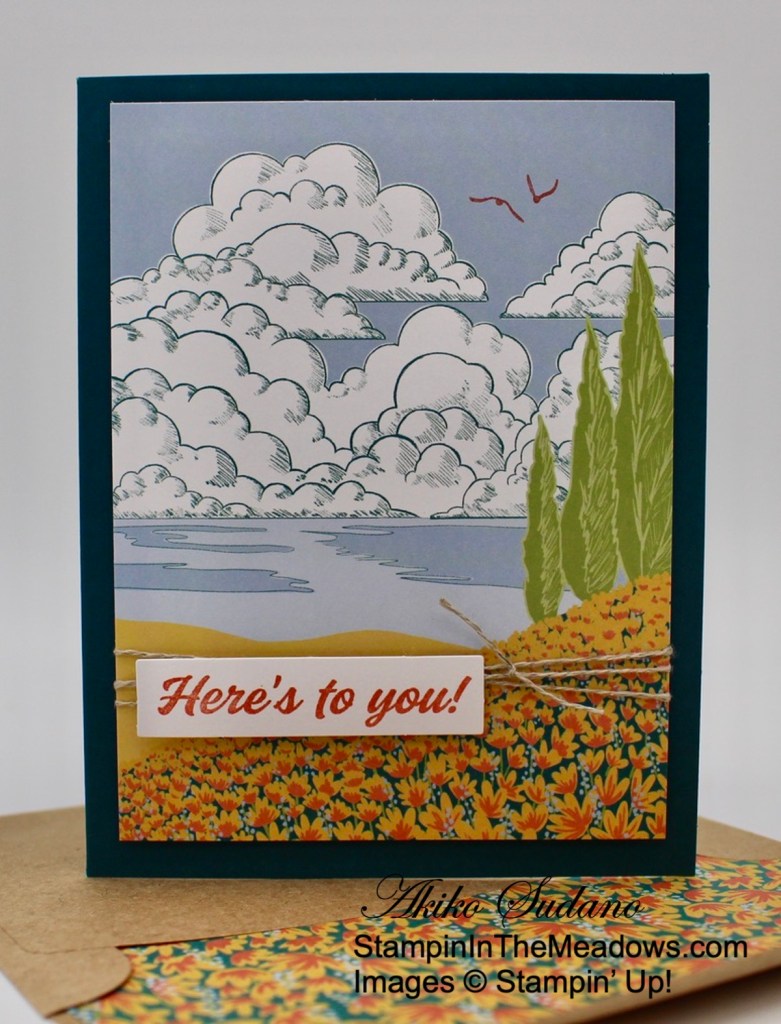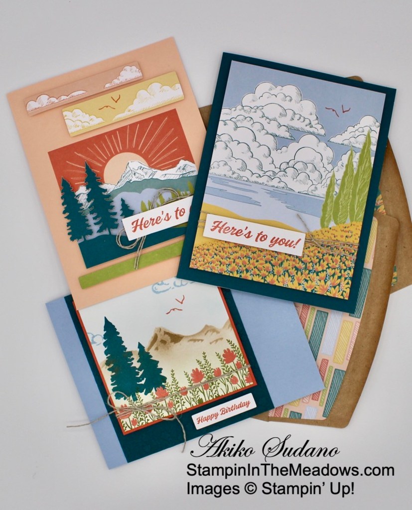 Good Morning! I got my Stampin’ Up! March Paper Pumpkin kit and made one of each of the cards. This was a really cool kit with beautiful outdoor scenes mixed with fun modern elements. The theme is Here’s To You! and it comes with a bonus of 4 stencils with a sponge. And I love the wildflowers!!😊