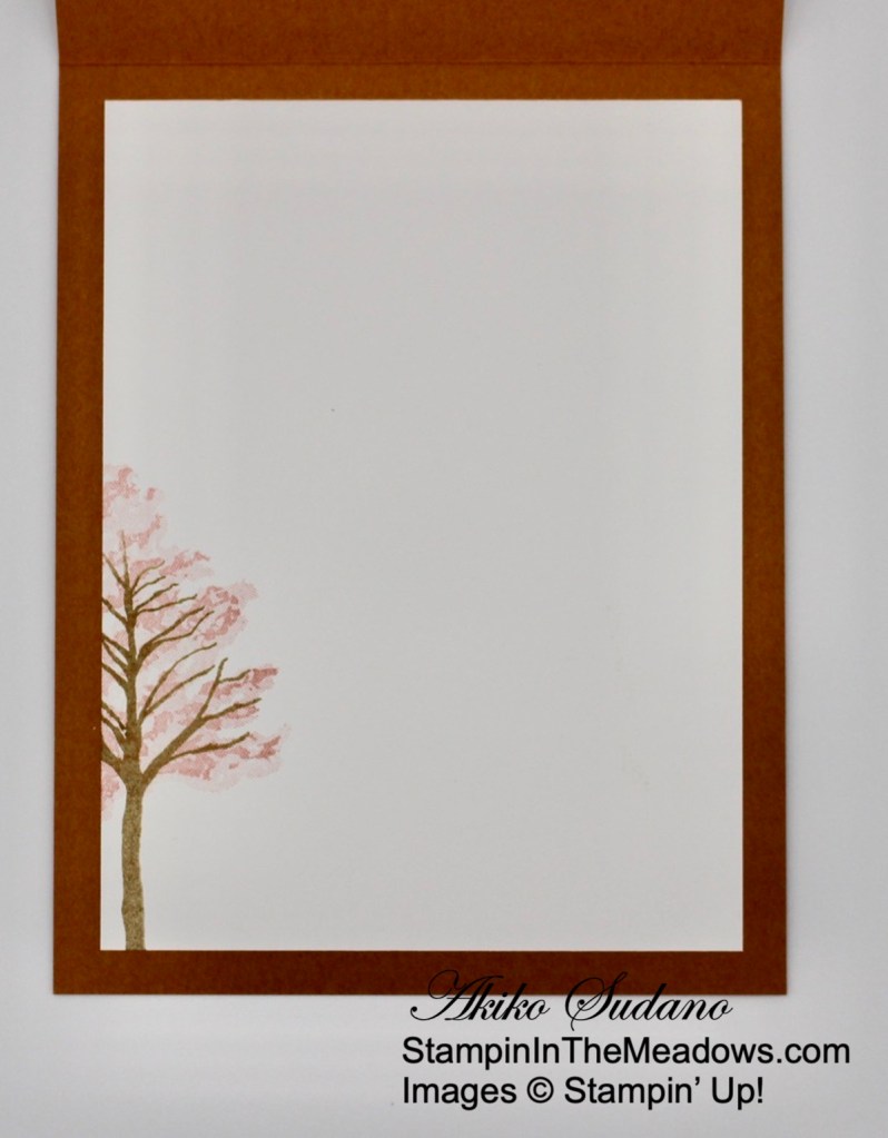 For the inside, I stamped the tree top in Blushing Bride ink on the bottom of a Basic White panel. I stamped the tree trunk in stamped off Soft Suede ink and adhered the panel to the inside of the card.