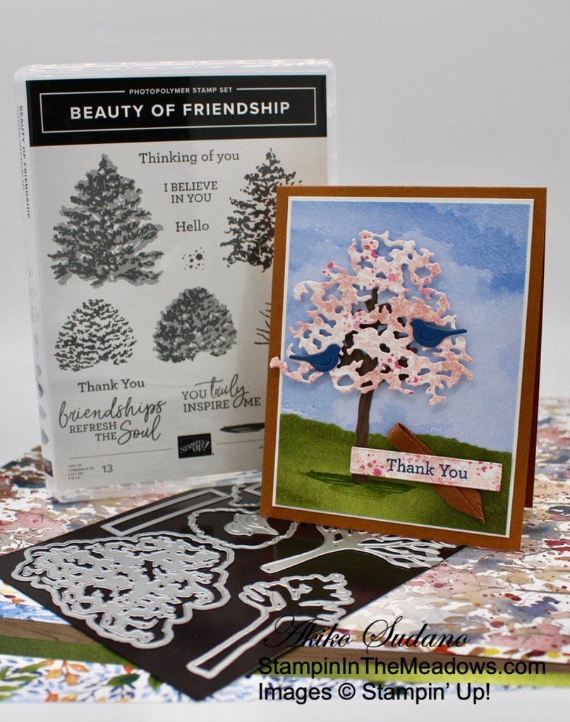 Good Morning! I hope you had a great weekend. Today I’m sharing a sneak peek of the beautiful Stampin’ Up! Beauty of Friendship bundle with a card that I made during my Facebook Live yesterday afternoon. This beautiful bundle lets you easily make trees with a watercolor look because of the two step stamps and the dies let you make different kinds of dimensional trees. You can find the currently available supplies I used at the bottom of my post along with the sizes of cardstock used. Note that all of the new In Colors and products will be available when the new 2021 – 2022 Annual Catalog goes live on May 4, 2021!