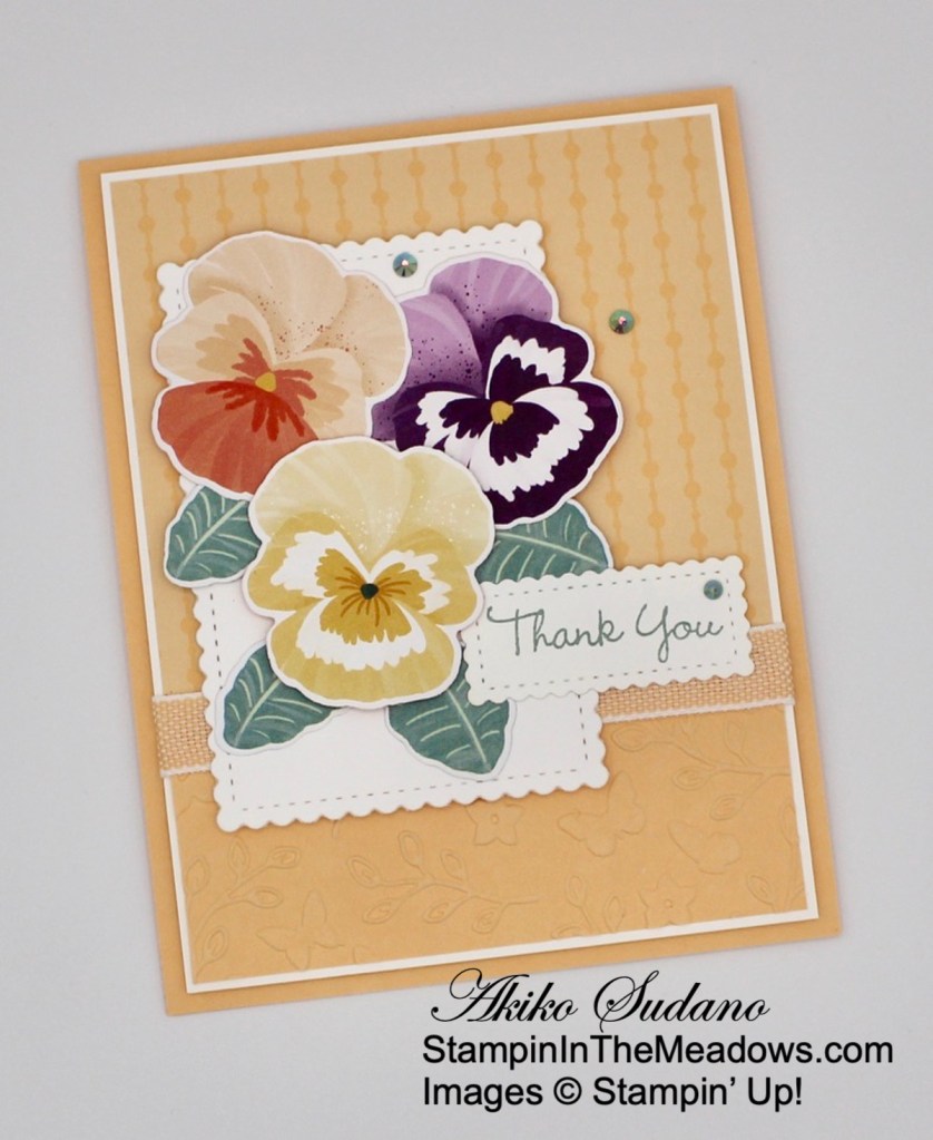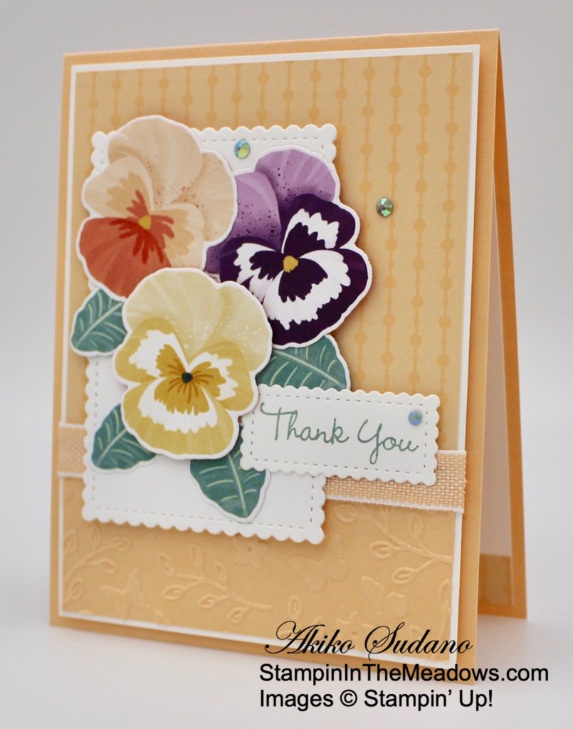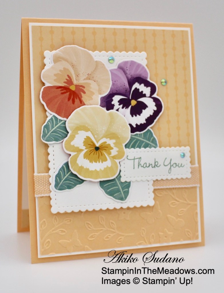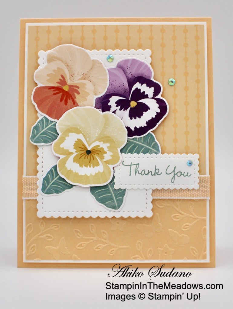 Good morning! One of the cutest bundles in the new 2021-2022 Annual Catalog is the Stampin’ Up! Pansy Patch bundle. Today I am using the Pansy dies with the new Pansy Petals designer series paper to make a sweet pansy Thank You card. You can find the currently available supplies I used at the bottom of my post along with the sizes of cardstock used. The Pansy Patch bundle along with the designer series papers and embellishments on my card will be available when the new 2021-2022 Annual Catalog launches next week on May 4, 2021.