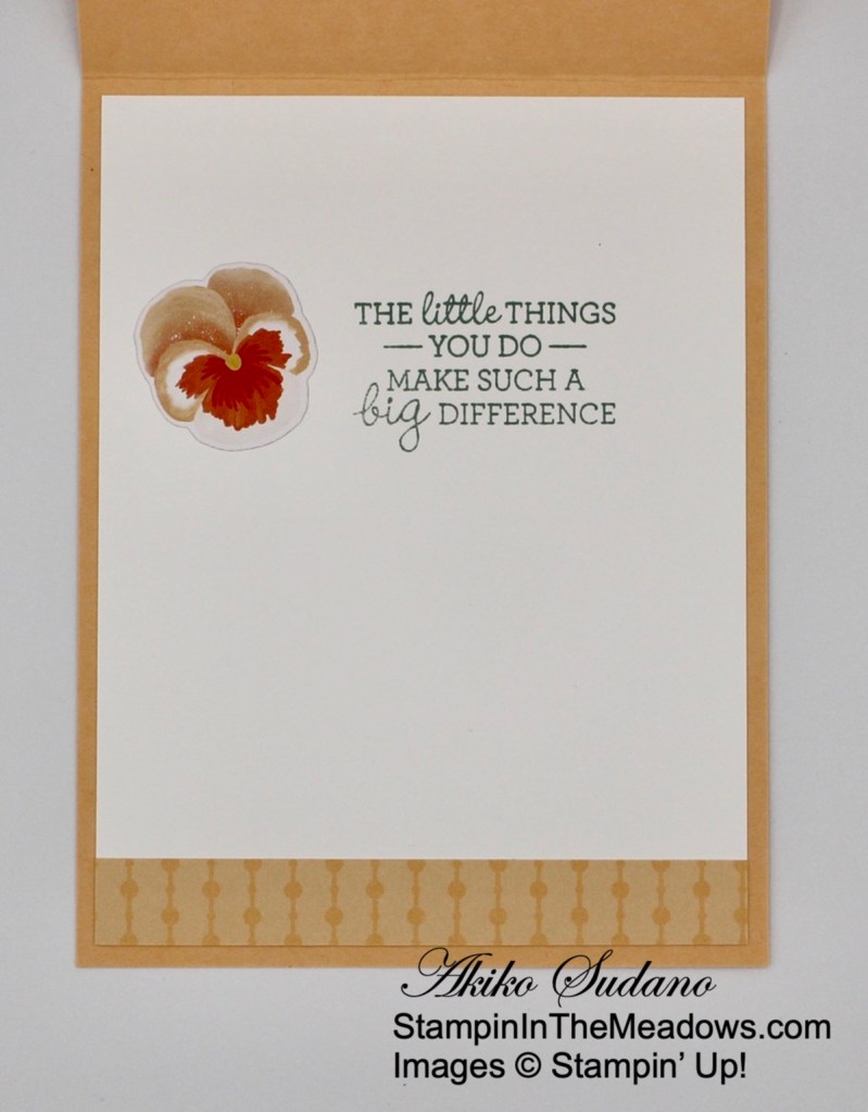 For the inside of the card, I cut a small pansy from the Pansy Petals DSP and adhered it to a Basic White panel. I stamped the sentiment from the Stampin’ Up! Pansy Patch stamp set in Soft Succulent ink next to the flower and adhered the striped Pale Papaya DSP to the bottom. I adhered the panel to the inside of the card.