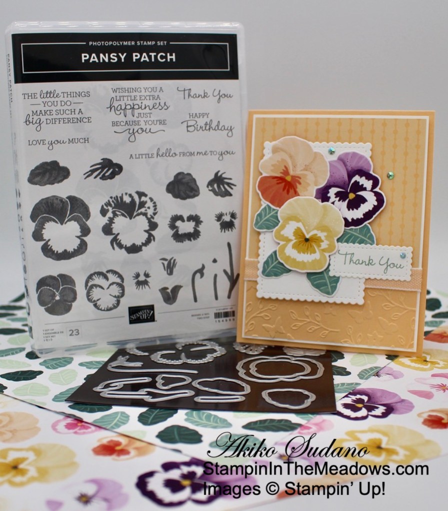 I love that the dies from the Stampin’ Up! Pansy Patch bundle can cut some of the images from the Pansy Petals designer series paper! It just gives you another option for using this wonderful new bundle. And it will finally be available next week on May 4, 2021! Here’s a picture of the bundle and my card along with the Pansy Petals DSP and the dies that you can use to cut the DSP.