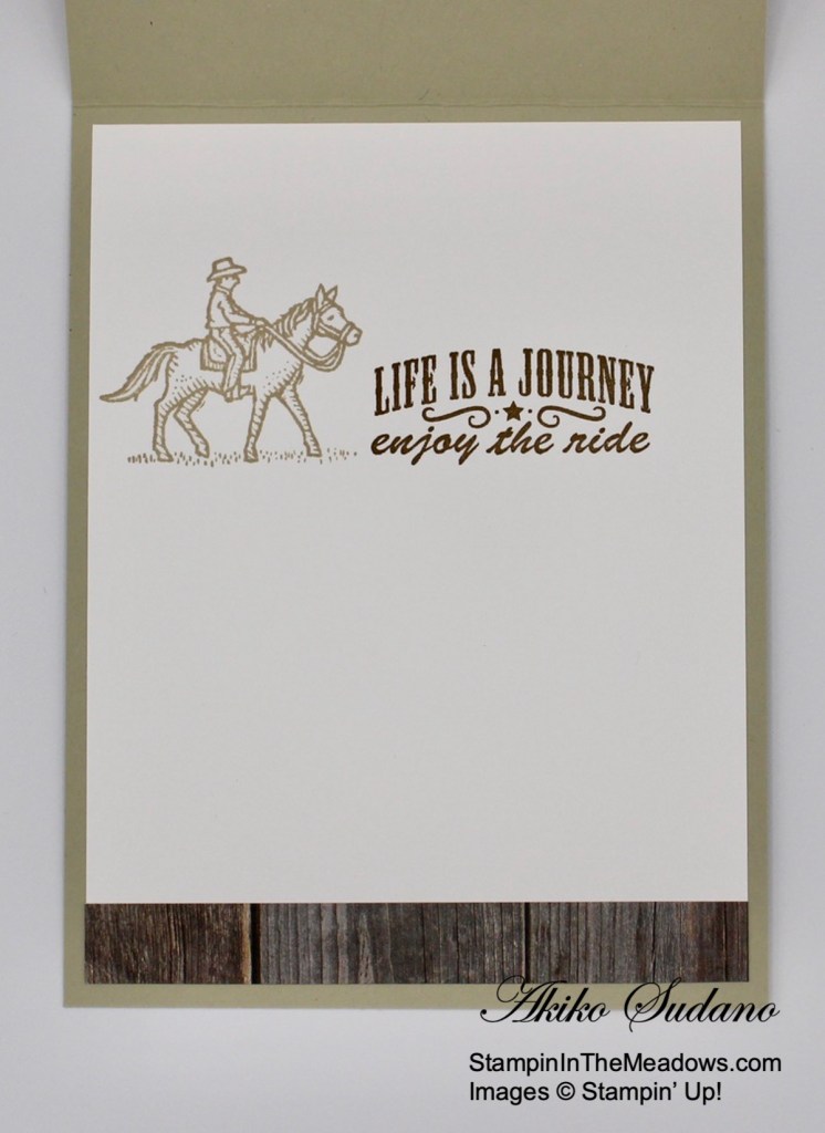 For the inside of the card, I stamped the the horse and rider from the Stampin’ Up! Ride the Range stamp set in Sahara Sand ink on a Basic White panel. I stamped the sentiment next to them in Soft Suede ink and adhered a strip of rustic wood grained In Good Taste DSP to the bottom. I adhered the panel to the inside of the card.